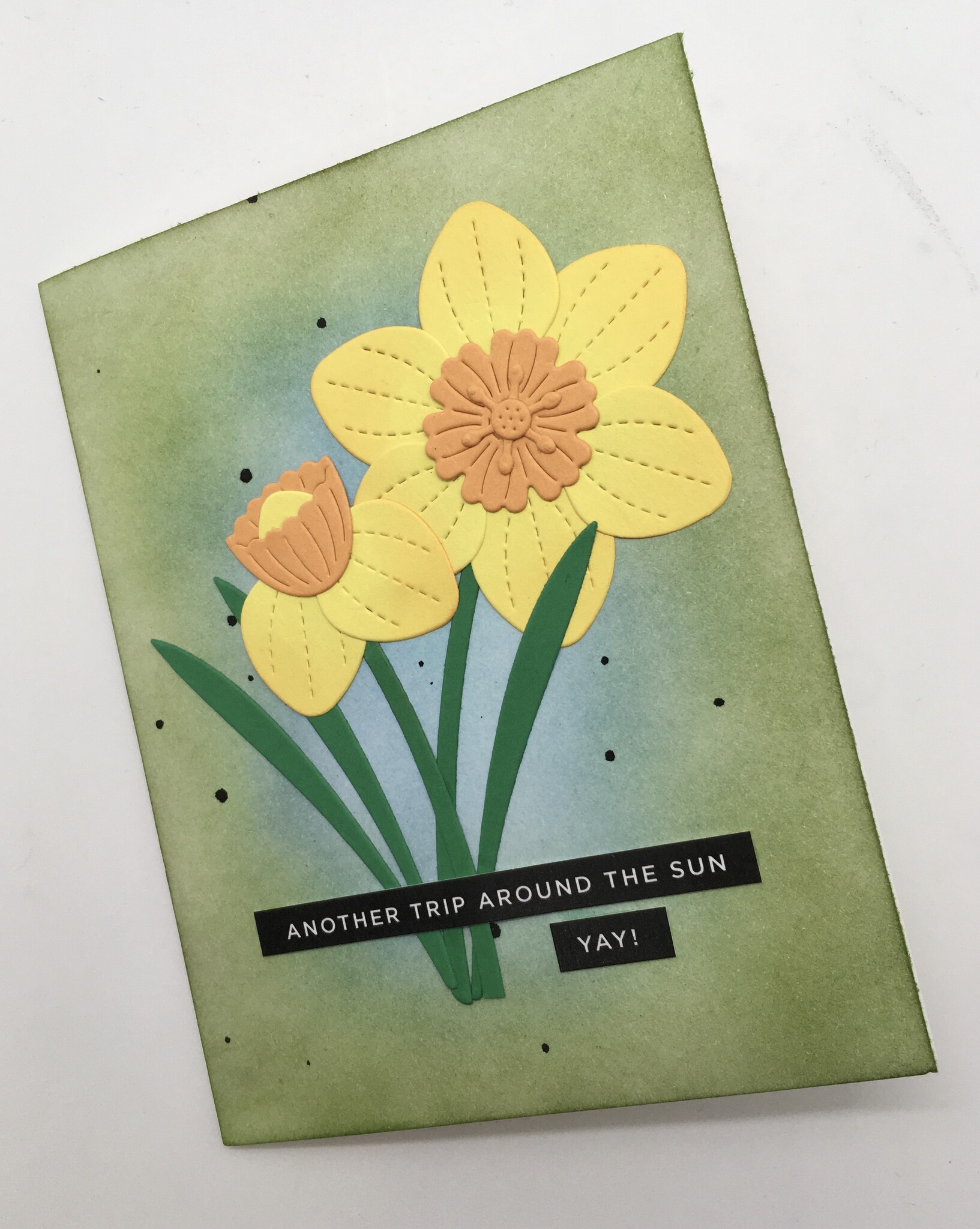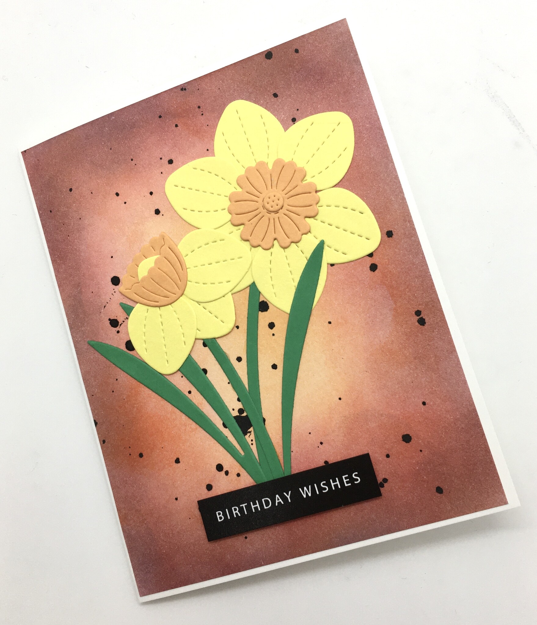 Daffodil birthday Cheapest shipping from $1.04 Stock Status: 2 pcs Delivery Status: 3-5 days $7 Quantity pcs Add To Cart Description Each card is unique as the backgrounds are ink blended and vary in colour. Each card measures 4.25 x 5.5 inches